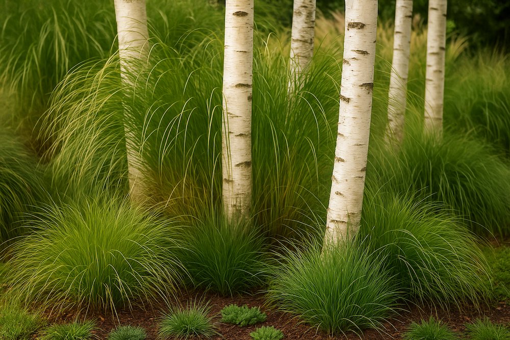 Kompozycje brzozy w ogrodzie warto uzupełnić o zwiewne trawy dekoracyjne, które w połączeniu z lekkimi koronami drzew wprowadzają ruch do przestrzeni.